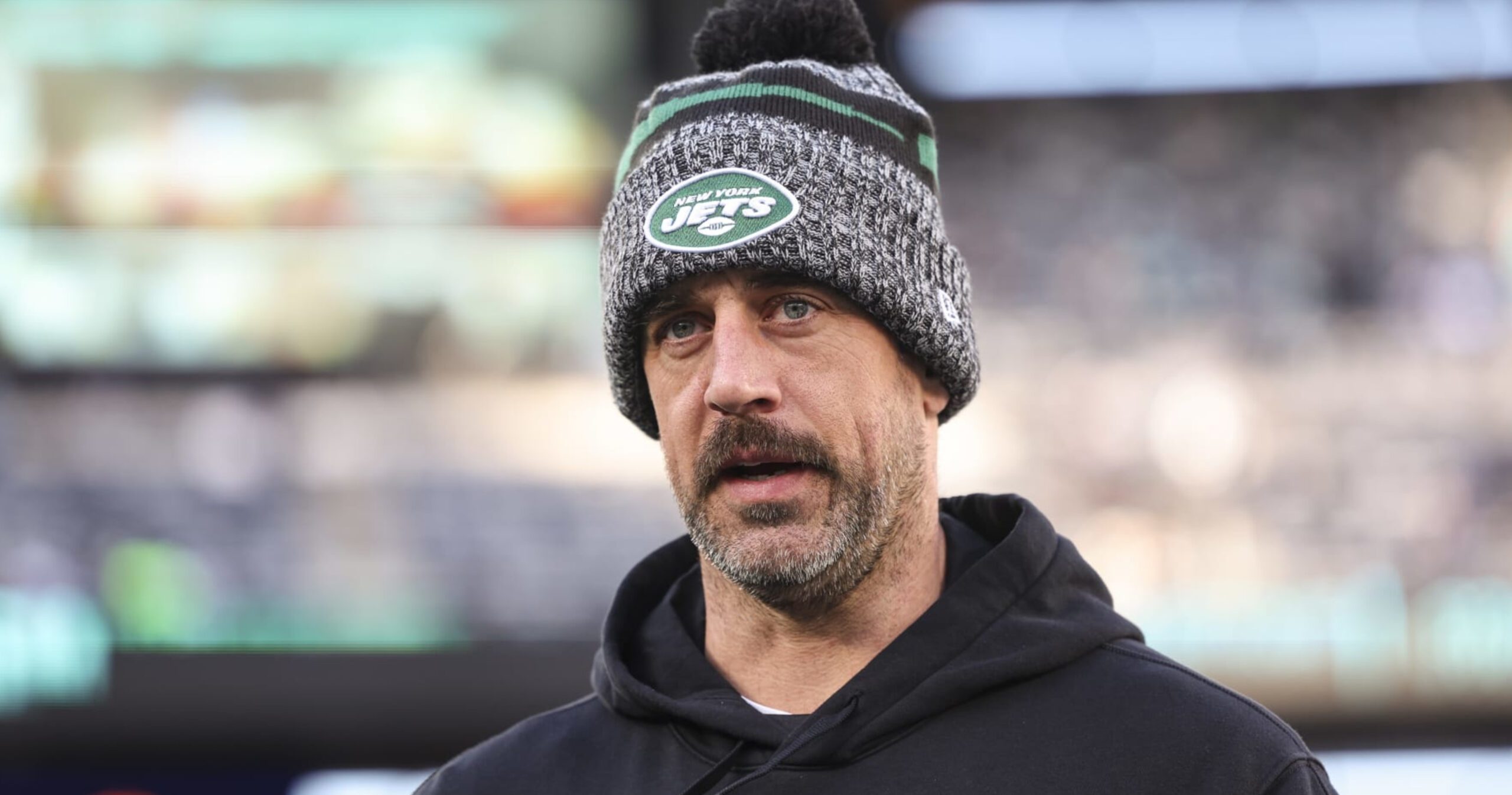 EAST RUTHERFORD, NJ – NOVEMBER 24: Aaron Rodgers #8 of the New York Jets looks on from the sideline prior to an NFL football game against the Miami Dolphins at MetLife Stadium on November 24, 2023 in East Rutherford, New Jersey. (Photo by Perry Knotts/Getty Images)