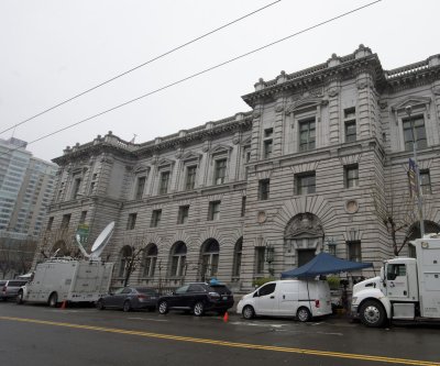 Media vehicles crowded the Mission Street side of the James R. Browning United States Courthouse, home to the 9th U.S. Circuit Court of Appeals, in San Francisco on February 7, 2017. The court Saturday blocked a concealed weapons ban from going into effect in California. Photo by Terry Schmitt/UPI | License Photo