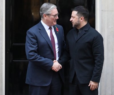 1 of 4 | British Prime Minister Keir Starmer (L) greets Ukrainian President Volodymyr Zelensky at No.10 Downing Street, London, on Friday. Photo by Hugo Philpott/UPI | License Photo