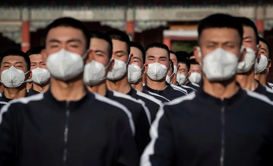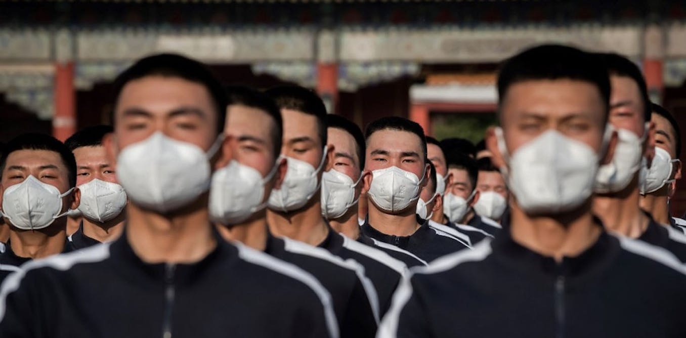 The Chinese army marches past the entrance to the Forbidden City on the occasion of the 2020 session of the National People’s Congress on May 22 in Beijing.