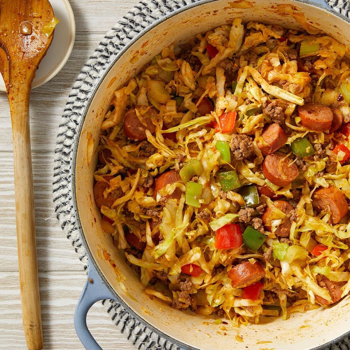 Add the ground beef and sausage, and stir to combine everything. Reduce the heat to medium-low. Cover the pot and cook the mixture, stirring occasionally, until the cabbage is softened and tender, 25 to 30 minutes. Serve it immediately.