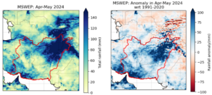 A figure showing Observed total accumulated precipitation during April-May 2024. A red highlight shows the study region comprising the most impacted regions. (right) same as (left) showing the anomaly w.r.t 1991-2020 period. [Data source: MSWEP]Figure 1: (left) Observed total accumulated precipitation during April-May 2024. The red highlight shows the study region comprising the most impacted regions. (right) same as (left) showing the anomaly w.r.t 1991-2020 period. [Data source: MSWEP]