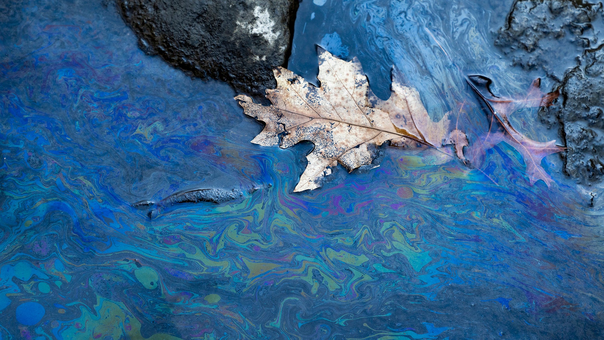 On a late August morning, Tsai asked me to stand on the freshly created edge of the pool, while he shook some dirt and rocks loose from the bank with a metal rod. As they tumbled into the water, an iridescent web spooled out across the water’s surface, emanating from the point Tsai had disturbed. He exclaimed into his respirator, declared the water as bad as he’d ever seen, and gestured for me to lean down and look closer. The simple fact of my body’s weight on the creek bank elicited a new burst of oily sheen, billowing into the still pool.