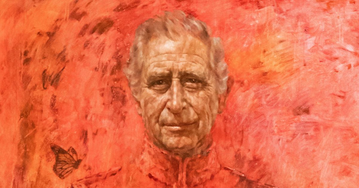 The larger-than-life painting by artist Jonathan Yeo captures the king with his hands clasped atop the hilt of his sword and a butterfly flitting above his right shoulder. Charles got his first look at the canvas Tuesday at Buckingham Palace.