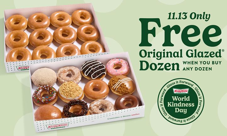 Krispy Kreme’s World Kindness Day offer is available Thursday in-shop and via drive-thru at participating U.S. shops and for pickup or delivery via Krispy Kreme’s website and app using code BOGOFREE, while supplies last. Limit two per guest.