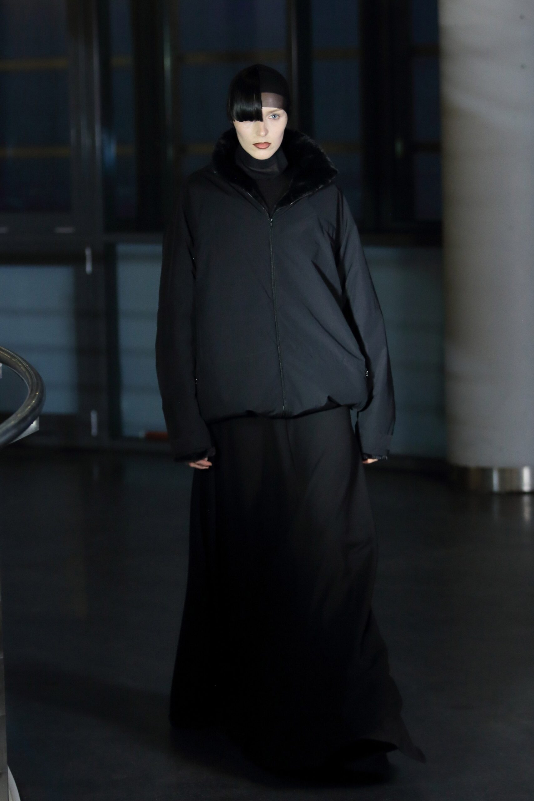 Drawing inspiration from Danish actress Asta Nielsen, who achieved success in Berlin during the silent film era, Arnika’s muse embodied a range of personas from an androgynous Hamlet to a seductive femme fatale in “Abyss.” The models, styled with hair reminiscent of Nielsen’s iconic pageboy haircut, confidently strutted down the spiraling floors of a former glass façade nightclub in pointy wide leg boots with double kitten heels, a collaboration with Untitlab. The atmosphere was enhanced by an electronic music set, adding a modern touch to the Berlin-inspired collection.