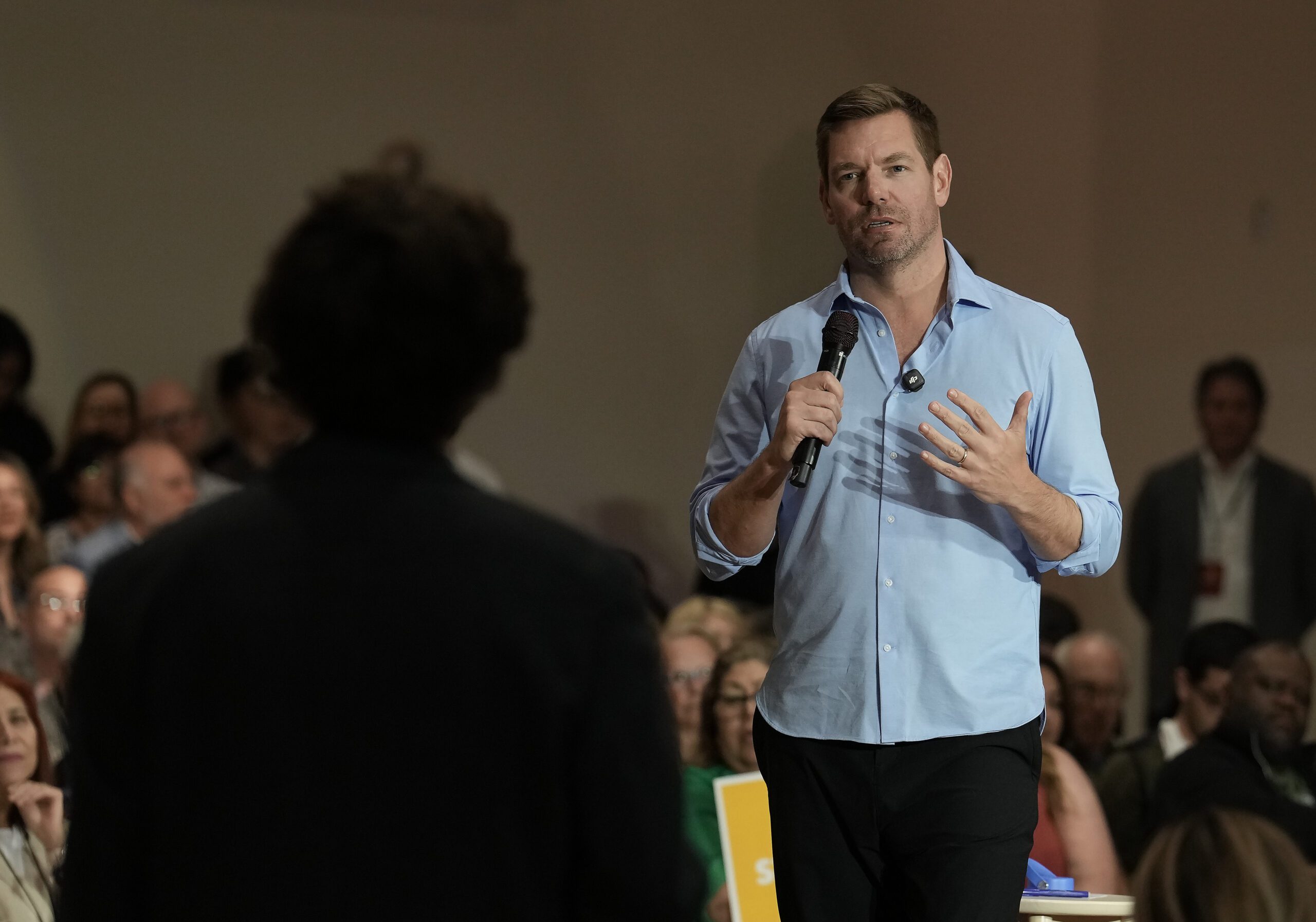 Rep. Eric Swalwell answers a question from a student during a town hall meeting.