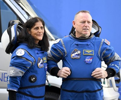 1 of 4 | NASA test pilots Suni Williams, left, and Butch Wilmore speak to NASA managers after walking out from the Operations and Checkout Building on Saturday at the Kennedy Space Center in Florida. Photo by Joe Marino/UPI | License Photo