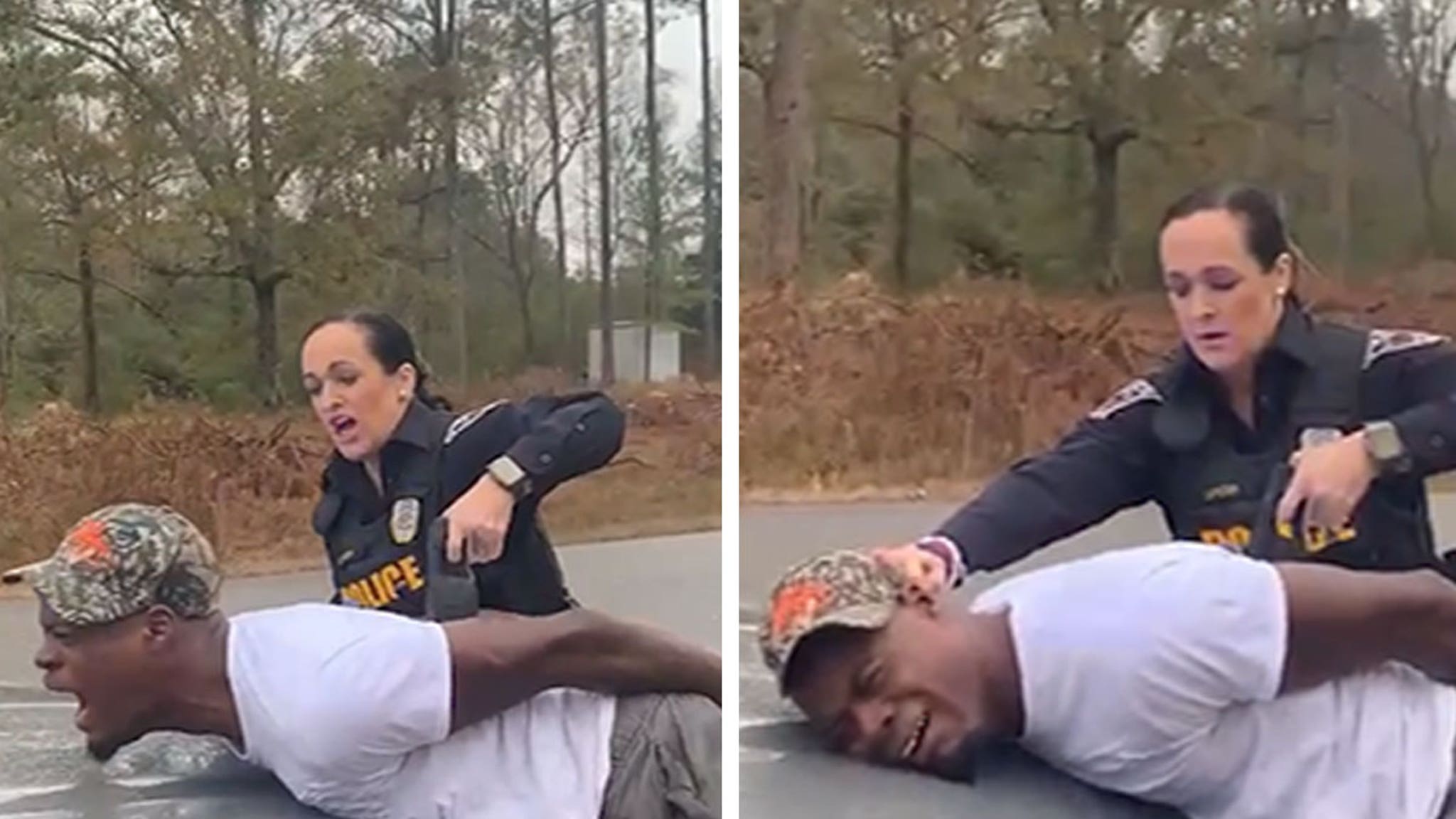 She’s seen shouting at the cuffed man to lie on the front of the vehicle with his face down and ordering him to “stay still.”